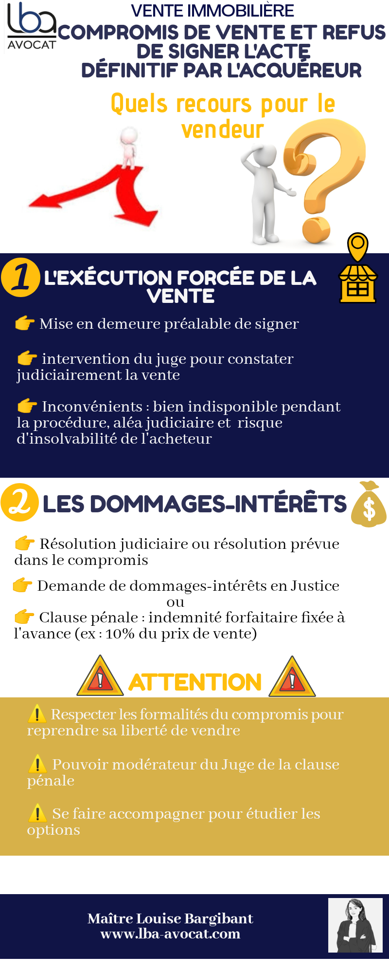 En résumé, le vendeur ne sera pas sans recours si l’acquéreur refuse finalement de signer sans motif légitime (à réserver notamment le cas de l’acquéreur d’une modification substantielle des conditions de la vente entre le compromis et la vente définitive).